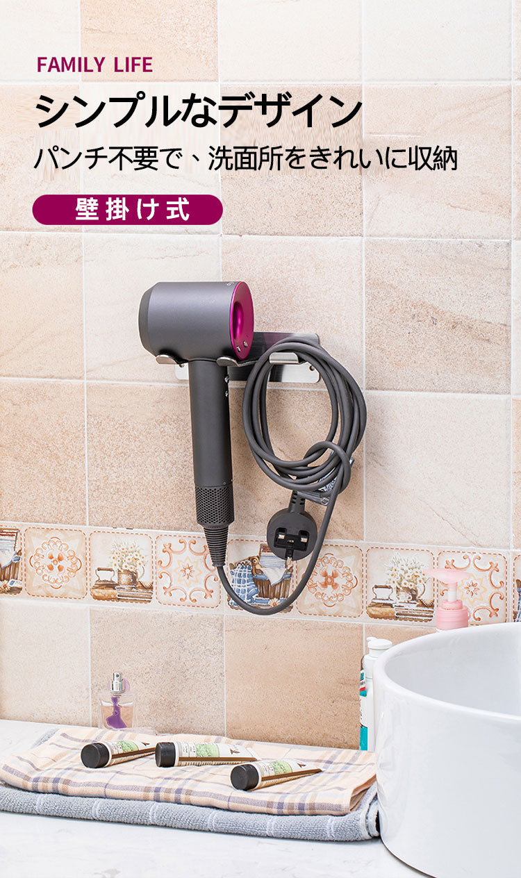 ◆ほぼ全てのドライヤーに対応可能。コードを巻きつけてすっきり収納できます。両面テープによる壁掛け式なので、手軽に自分の好きな場所へ設置できるのもメリット。シンプルなデザインで、ひとまずドライヤーだけを置きたいという方は要チェックです。