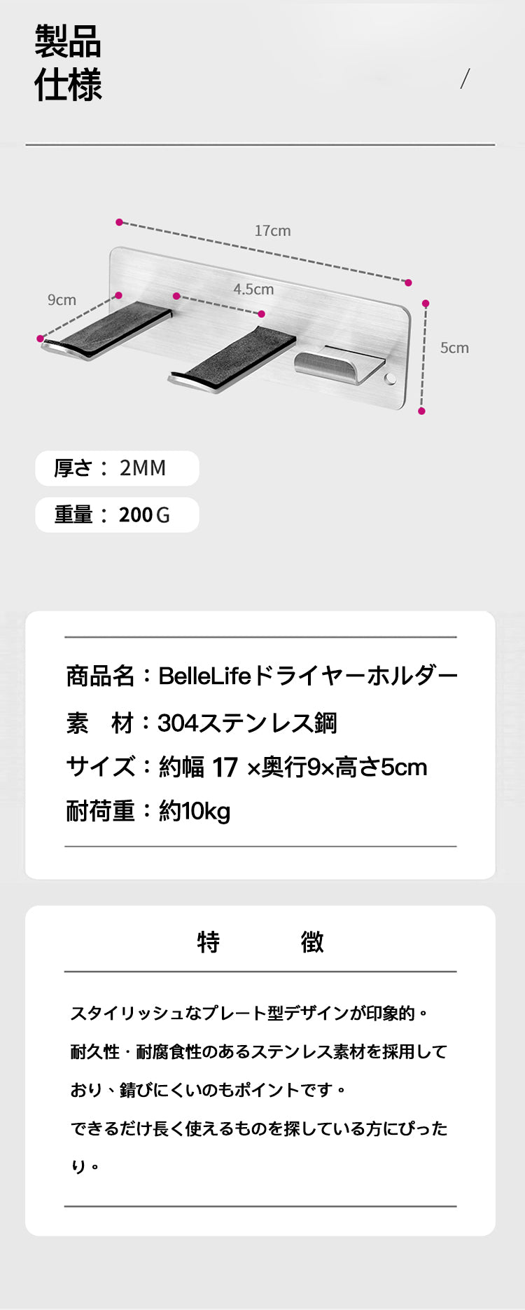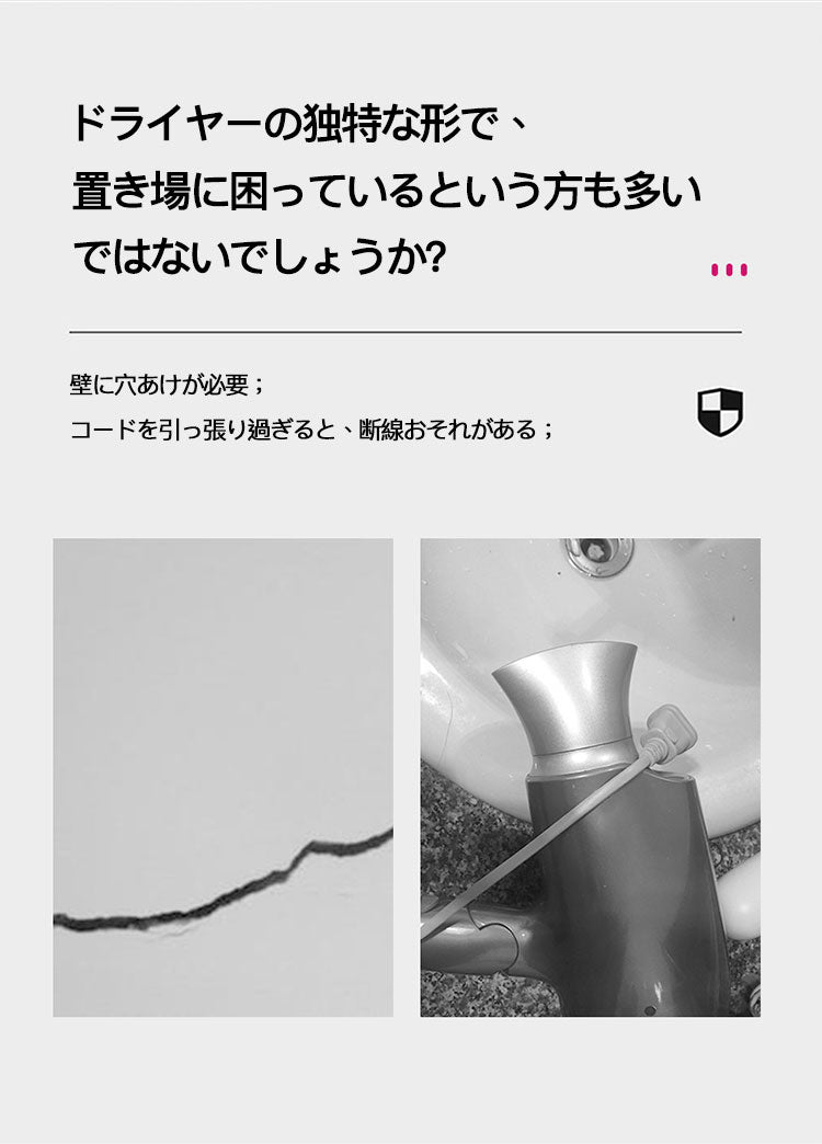 ◆耐荷重は約10kgあり、ドライヤーを支えるのには強度も十分です。収納しやすいのはもちろん、ドライヤーを取り出しやすいのも特徴です。使用後のドライヤーをスポッと入れるだけで楽です。朝の忙しい時間やシャワーの後、身支度を少しでも手早く済ませたい方にぴったりです。